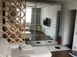 В квартире выполнен высококачественный ремонт с применением дорогих материалов. На стенах покрытие венецианская штукатурка и краска. Дополнительная шумоизоляция. Пол - испанская керамическая плитка и ламинат самого высокого класса. Декоративные элементы интерьера - перегородка из деревянных колец, двухуровневый потолок, двери Купе. Импортная Сантехника. Кухонный гарнитур из высококачественных материалов и фурнитурой Blum остаётся Вам. Пластиковые окна высшей категории. Качественные Стеклянные двери в ванную комнату и душевой отсек. Полы в ванной и на кухне с подогревом. Во всех комнатах, включая кухню выведены и установлены розетки для TV и интернета. Также в гостиной под потолком проложены дорогие акустические провода для домашнего кинотеатра. Сантехника вся немецкая, плитка испанская на кухне и ванной комнате. Боковые элементы батарей убраны в короба.