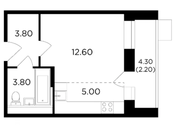 Просторная лоджия, совмещенный санузел и комната с кухней - будут неотъемлемой частью квартиры.